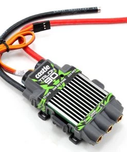 This is the Castle Creations Talon 90 Brushless ESC. Castle’s Talon 90 ESC sports a BEC designed for today’s servos, pumping out up to 20 amps peak power and 9 amps of continuous power to keep even the hungriest servos happy.