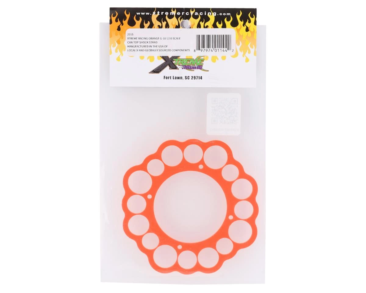 Xtreme Racing 1/10 G-10 Can Top Shock Stand. This simple and sweet tool is great for rebuilding shocks on the go. All you need is this shock stand and a 12oz. aluminum can. The holes in this stand allows for holding 13mm, 14.5mm, 16mm and 18mm shock bodies. Package includes one shock stand.