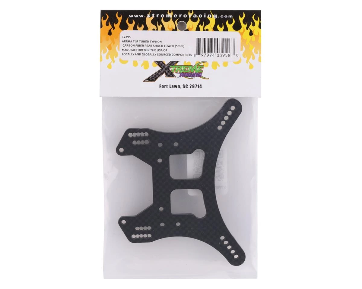 Xtreme Racing Arrma Typhon “TLR Tuned” 5mm Carbon Fiber Rear Shock Tower. This optional rear shock tower is intended for the Arrma Typhon “TLR Tuned”. Made from 5mm thick carbon fiber, this shock tower is designed to securely hold your rear shocks in place. Package includes one rear shock tower.