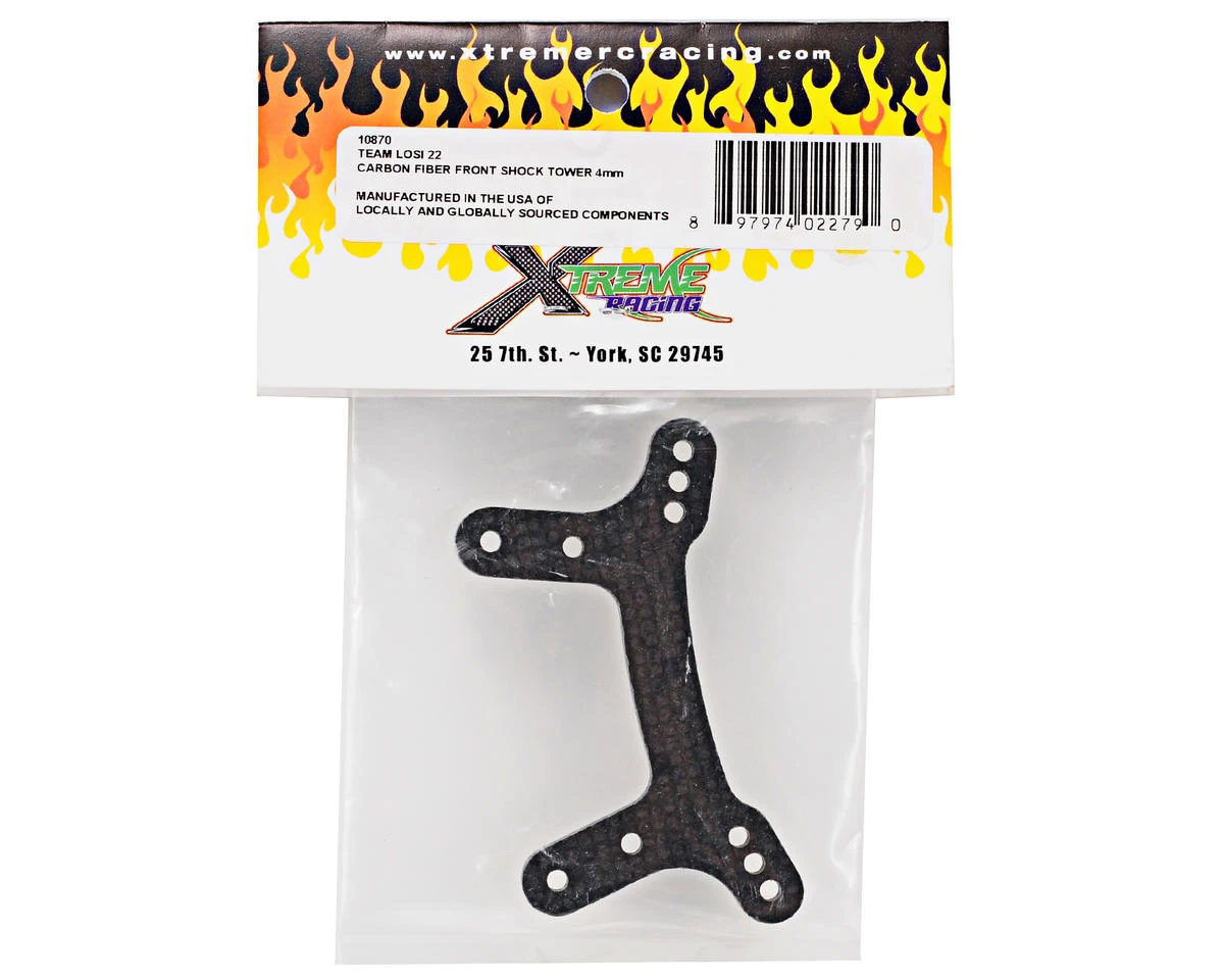 This is an optional Xtreme Racing Carbon Fiber Front Shock Tower, and is intended for use with the Losi 22 1/10 buggy. This American made shock tower is a direct replacement for the stock plastic tower, and has been machined from high quality carbon fiber for improved durability and stiffness.