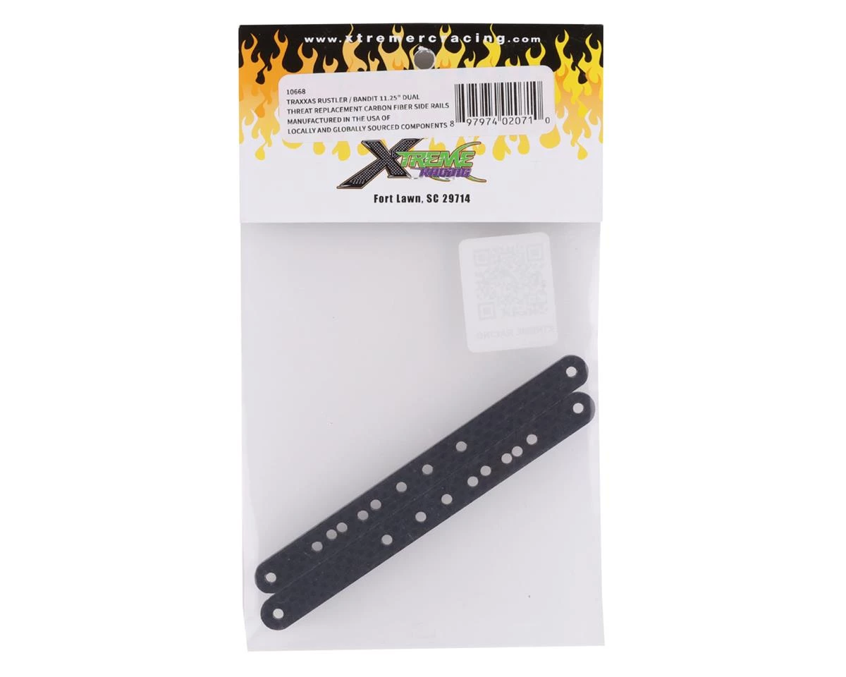 Xtreme Racing Traxxas Rustler/Bandit 11.25″ Dual Threat Carbon Side Rails. These side rails are intended for the Traxxas Rustler or Bandit equipped with the optional Xtreme Racing Traxxas Rustler/Bandit 11.25″ Drag Chassis (XTR10666). Package includes two side rails.